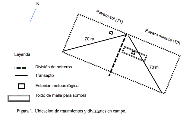 Manejo de los potreros. Se utilizaron dos potreros (uno para cada tratamiento) con una superficie de 0,13 ha/potrero, sembrados de pasto estrella (Cynodon nlemfuensis). El manejo general de estos fue rotacional (40-60 días de descanso); sin embargo, para los efectos del ensayo el pastoreo fue continuo. No se aplicó riego, y la carga animal fue de 1,24 UA/ha.