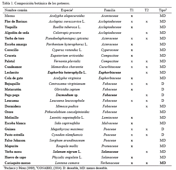 Composición botánica. Se identificaron 27 especies pertenecientes a 14 familias (tabla 1). La especie predominante fue el pasto estrella (C. nlemfuensis), con presencia en ambos tratamientos. Del total de especies el 78 y el 52 % se encontraron en T1 y T2, respectivamente, y solo el 33 % estuvo presente en ambos tratamientos. Se observó un mayor número de especies en las partes más bajas de ambos potreros; sin embargo, especies como Asclepias curassavica y Leucaena leucocephala (rebrotes) se localizaron en toda el área del potrero. Algunas especies presentes consideradas no deseables, como A. curassavica y Mimosa pudica, son difíciles de erradicar debido a su crecimiento y reproducción continua (Villalobos y Arce, 2013).