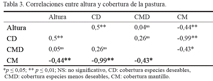 Durante el ensayo de observó un comportamiento inverso entre la cobertura de especies deseables y la cobertura del mantillo (tabla 2), lo cual evidenció una asociación negativa (tabla 3); ello pudiera ser producto de la continuación del crecimiento del pasto estrella y la senescencia en la época de lluvias y una mayor acumulación de mantillo debido a la baja carga animal.