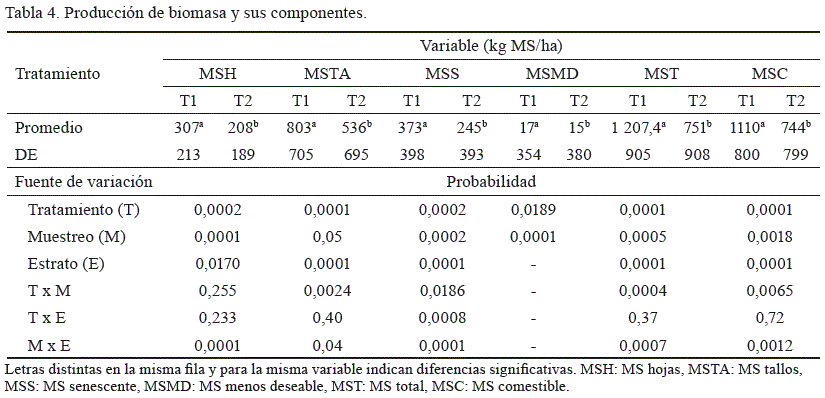 Producción de biomasa. Las muestras se cosecharon a 5 cm desde el suelo y fueron pesadas en el campo. Posteriormente se colocaron en estufa a 100 ºC hasta alcanzar peso constante, para determinar la materia seca (MS). La biomasa se expresó en las siguientes variables: materia seca hoja (MSH), materia seca tallo (MSTA), materia seca senescente (MSS), materia seca de especies menos deseables (MSMD), materia seca total (MST) y materia seca consumible (MSC: MSH + MSTA).