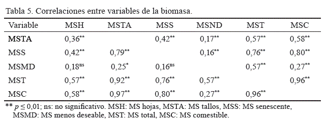 Producción de biomasa. Las fuentes de variación y algunas de sus interacciones (tabla 4) fueron significativas (p ≤ 0,05). La alta significación del tratamiento (tabla 4) y la baja proporción de sombra artificial sugieren un efecto topográfico, ya que ambos potreros estaban ubicados consecutivamente al pie de una montaña. Por otro lado, se demostró que durante el experimento hubo variación en las diferentes variables de la producción de biomasa (tabla 4), por la significación de las fuentes de variación muestreo y estrato (p ≤ 0,05), además de la asociación entre variables (tabla 5) con un posible efecto en los patrones de defoliación (Espinoza et al., 2001; Camacaro, 2012). Resultados similares en cuanto al estrato fueron reportados por Alvarado (2000), quien obtuvo que la producción de MS en el pasto estrella con 23 a 30 días de rebrote fue de 55 % de hojas en el estrato superior y 37 % de hojas en el estrato medio.