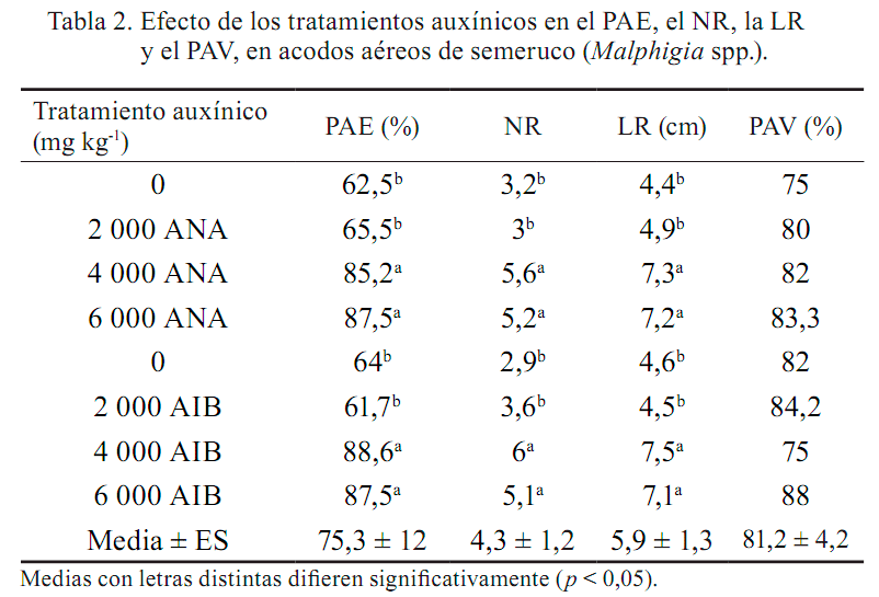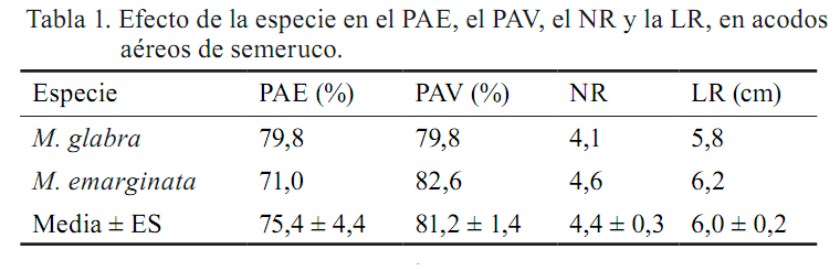 En cuanto a las demás variables, M. glabra presentó 79,8 % de PAV; 4,1 raíces por acodo y LR de 5,8 cm, valores similares estadísticamente a los de M. emarginata (tabla 1). Es importante señalar que los acodos muertos pudieron deberse a la presencia de una alta población de hormigas, que ocasionó la pérdida del sustrato.