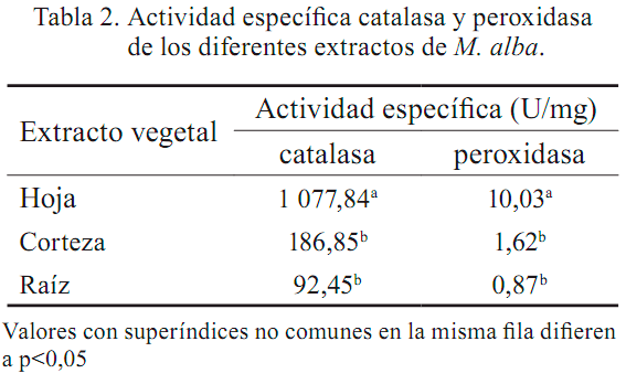 En la tabla 2 se muestra la actividad específica de las enzimas antioxidantes catalasa y peroxidasa. Como puede apreciarse, en ambas enzimas los extractos de la hoja mostraron valores superiores y significativamente diferentes a los de la corteza y la raíz, que fueron semejantes y no difirieron estadísticamente. Resultados similares se reportaron para 10 variedades e híbridos de M. alba, en los cuales la hoja presentó la mayor actividad, seguidas de la corteza y de la raíz (Díaz et al., 2010).