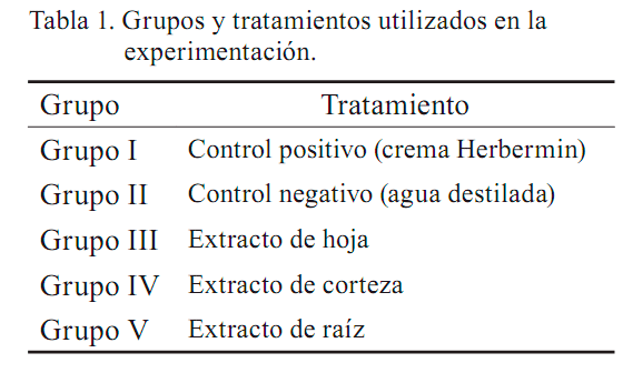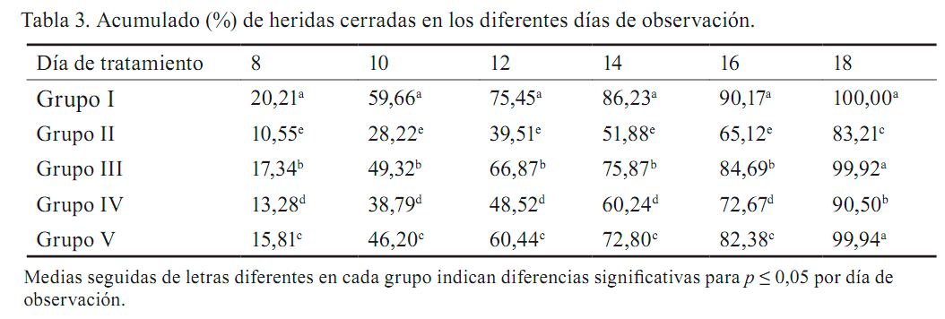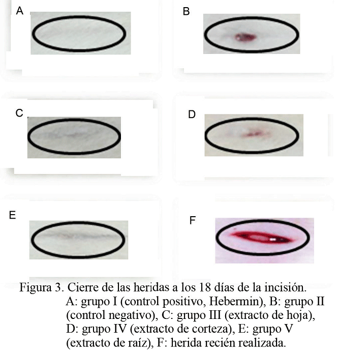 En la tabla 3 se muestran los porcentajes de heridas cerradas a medida que fueron transcurriendo los días de cicatrización. El extracto de hoja (grupo III) y el de raíz (grupo V) no presentaron diferencias significativas con el control (grupo I) a los 18 días después de realizada la incisión. El extracto de corteza (grupo IV) fue significativamente inferior a los anteriormente descritos, pero superior al control negativo (grupo II), y mostró 90,5 % de cierre. Ello pudiera sugerir que las concentraciones de metabolitos secundarios de dicho tejido podrían estar actuando positivamente en el proceso de regeneración del área dañada, aunque no con la eficiencia de los presentes en la hoja y la raíz.