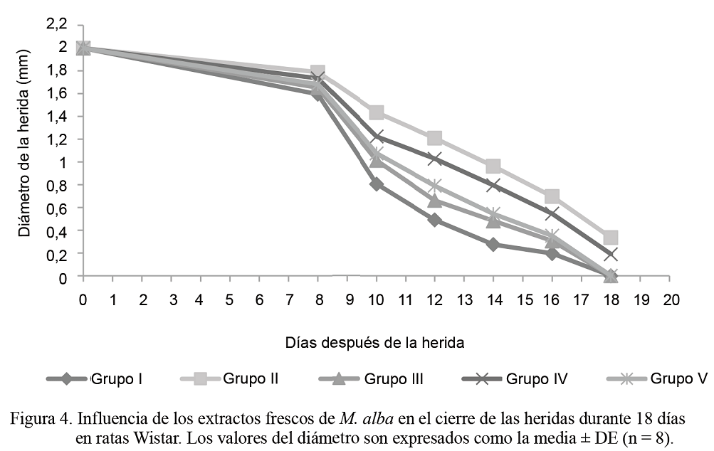 El proceso de cicatrización estimulado por el uso de compuestos bioactivos de plantas puede ser monitoreado mediante el seguimiento de la reducción del tamaño de la incisión. Los resultados de las observaciones macroscópicas del cierre de las heridas se describen a continuación. Dentro de los indicadores evaluados se tuvo en cuenta la coloración, que demostró evolución clínica dentro de lo previsto para cada etapa de la cicatrización. Se pudo observar en todos los grupos el predominio de una coloración rosada, que es característica de la epitelización y representa la fase final de la reparación de tejidos. Casi todos los animales comenzaron a presentar la formación de la costra hemática entre los tres y cuatro días y su caída inició a partir del día seis, sin diferencias entre los tratamientos. A partir del día ocho se observó el cierre de las heridas en los diferentes grupos y a los 18 días las heridas en los grupos I, III y V estaban completamente cerradas; ello demostró la efectividad de los extractos frescos de hoja y de raíz en relación con el control (fig. 4).