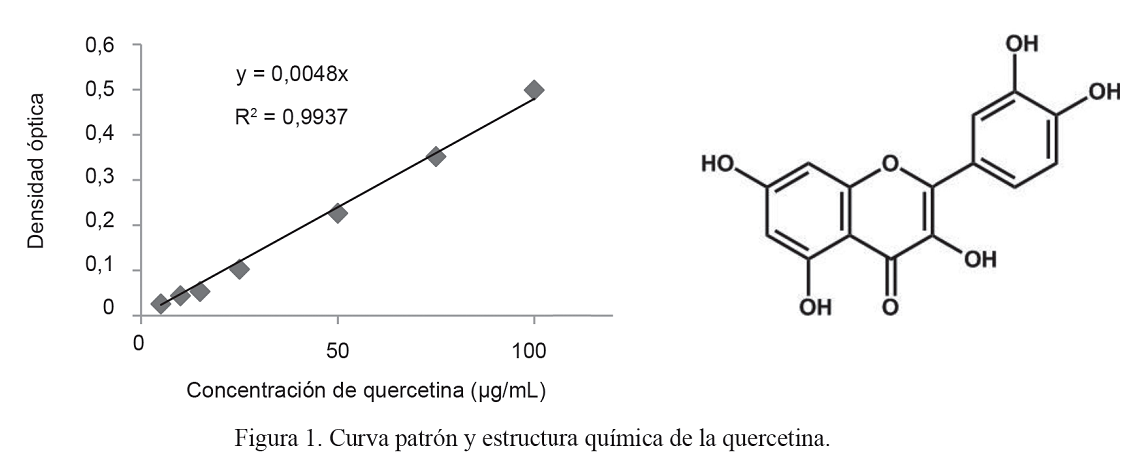 Para la determinación de los flavonoides en extractos vegetales se utilizó la quercetina como estándar. La recta patrón mostró un R2 de 0,9937 (fig. 1). En estas condiciones se puede afirmar que dicha ecuación puede ser utilizada para la determinación cuantitativa de flavonoides, expresados como miligramos de quercetina.