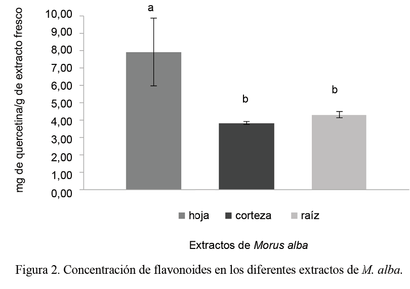 La concentración de flavonoides en los diferentes extractos de morera, expresados en miligramos de quercetina por gramos de extracto fresco, se muestra en la figura 2 El extracto de la hoja presentó los mayores valores y difirió significativamente de los de la corteza y la raíz, que no presentaron diferencias significativas entre ellos.