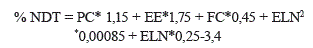 Los nutrientes digestibles totales (NDT) se calcularon empleando la fórmula de predicción matemática (NRC, 2001):