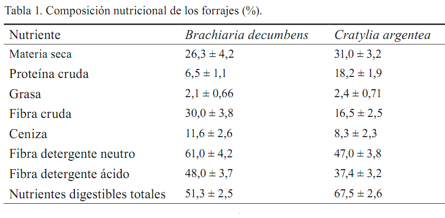 La materia seca de C. argentea (31,0 % ± 3,2) resultó mayor que la de B. decumbens (tabla 1); estos valores fueron menores que los obtenidos por Roa y Ladino (2015) en la época de invierno (33,3 %).