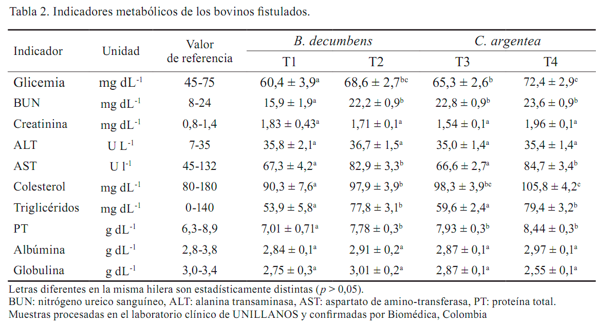 A su vez, los indicadores metabólicos a nivel sanguíneo se han utilizado para evaluar el grado de efectividad de la alimentación y la magnitud del desequilibrio energético y proteico. Estudios realizados por Roa y Ladino (2015) indicaron que el uso de probióticos puede modificar aspectos de la fermentación ruminal y, por tanto, sus metabolitos. Campos et al. (2007), en experimentos con novillas de siete razas diferentes que fueron alimentadas con una dieta similar, determinaron la influencia de la raza en la glucosa, que resultó superior en Lucerna respecto al promedio de las demás razas (3,2 vs. 2,8 mmol L-1); similar comportamiento se observó para el colesterol.