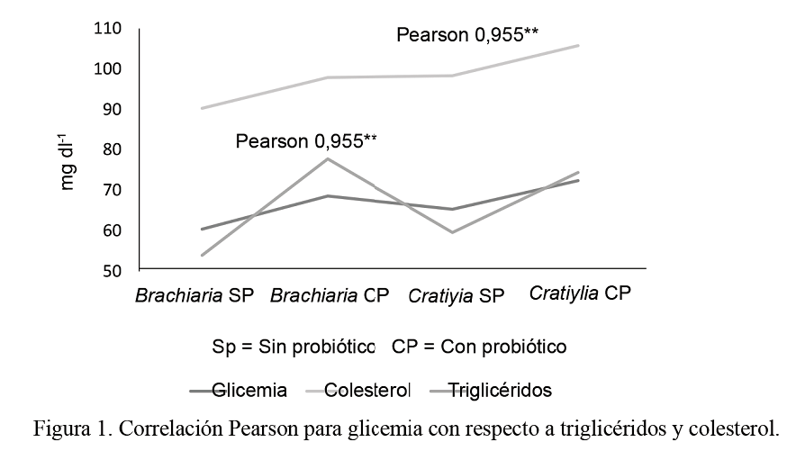 Rúgeles et al. (2012), en estudios con toros Brahman en pastoreo de B. decumbens y Brachiaria humidicola, hallaron que los niveles de glicemia y colesterol fueron mayores (66,5 y 133,9 mg dL-1) respecto a los de T1 de este experimento. Si se comparan estos valores con los de T4, la glucosa fue superior (72,4 mg dL-1); sin embargo, no sucedió igual con el colesterol, que fue de 105,8 mg dL-1 para T4. Ello indica que el suministro de la leguminosa y el probiótico influyeron más en la concentración de glucosa que en la del colesterol (tabla 2).