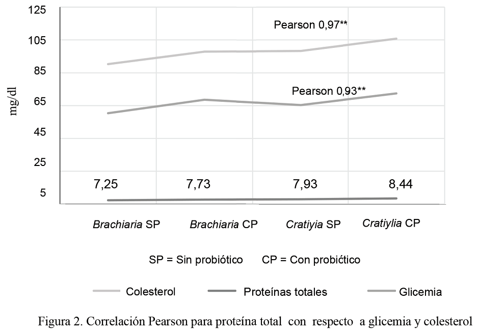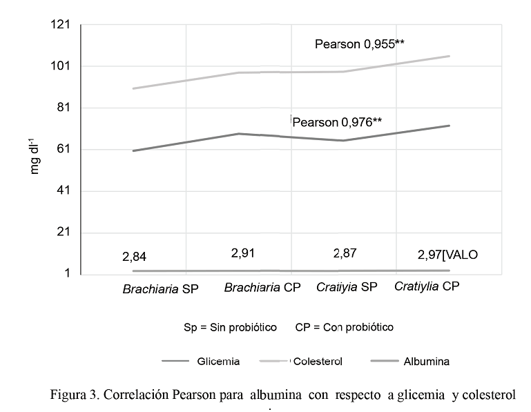 Finalmente, se encontró una correlación positiva (fig. 3) entre el colesterol y la albúmina (rxy = 0,995); se considera una asociación directa (rxy = 0,13), según Restrepo et al. (2010), atribuida a que la albúmina es la responsable de transportar a nivel plasmático algunos compuestos derivados del colesterol, entre ellos las hormonas. Es posible que los tratamientos con probiótico y C. argentea beneficien todos estos procesos para un mayor aprovechamiento de los forrajes en climas tropicales.