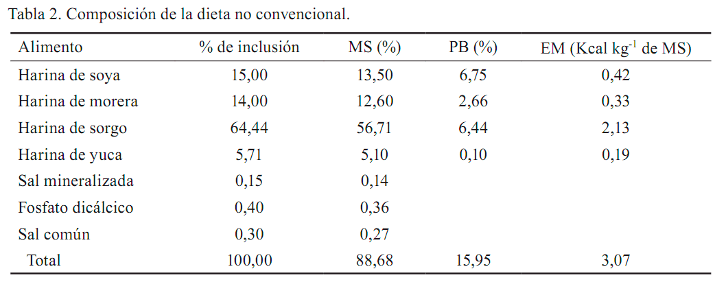 Procedimiento experimental. El concentrado convencional fue suministrado por la fábrica de piensos Rómulo Padrón, de Jaruco –Mayabeque, Cuba– y la soya provenía de la Empresa Nacional Flora y Fauna, perteneciente al Ministerio de Agricultura del país. Las harinas de morera, yuca y sorgo se elaboraron en la propia estación. Las raciones se formularon de modo que fueran isoproteicas e isoenergéticas y que cumplieran las recomendaciones de la National Research Council (1998); se completaron con minerales y vitaminas, según los requerimientos establecidos.