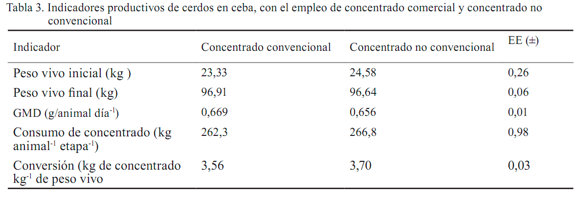 No se encontraron diferencias significativas entre tratamientos para ninguno de los indicadores estudiados. La ganancia diaria está dentro del rango informado por la literatura para la etapa de crecimiento ceba (Contino-Esquijerosa et al., 2008; Ly y Pok, 2014), al igual que la conversión alimentaria, la cual no superó los 3,5 kg de concentrado y demostró que el consumo voluntario de las dietas fue similar, a pesar de que el contenido de fibra bruta fue superior en el tratamiento II, que incluyó harina de forraje de morera en un 14 % de la ración.