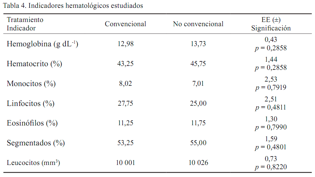 En cuanto al estado de salud de los animales, no se detectaron diferencias estadísticas en los indicadores hematológicos entre tratamientos, a pesar de que se apreció una tendencia al aumento de la hemoglobina y el hematocrito en el grupo experimental (pienso criollo) respecto al control (tabla 4).