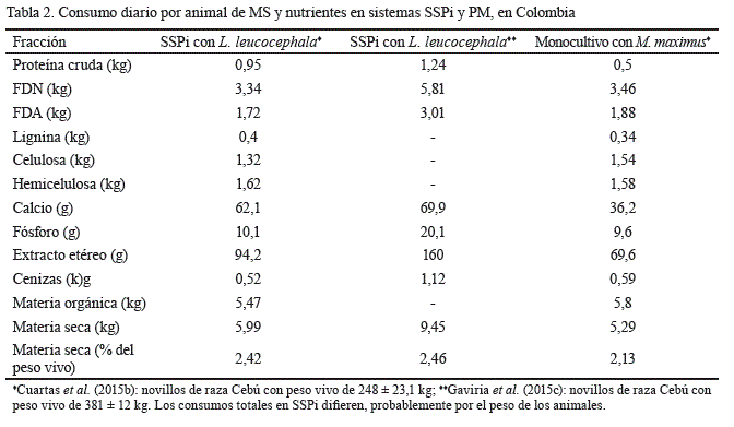 Los animales que pastorearon en SSPi con presencia de L. leucocephala tuvieron consumos de MS hasta 1,3 veces mayores que aquellos que pastorearon en sistemas convencionales de pastoreo (tabla 2). En los SSPi, el consumo de leucaena puede representar entre el 25 y el 30 % del total de MS ingerida (Cuartas et al., 2015b; Gaviria-Uribe et al., 2015c).