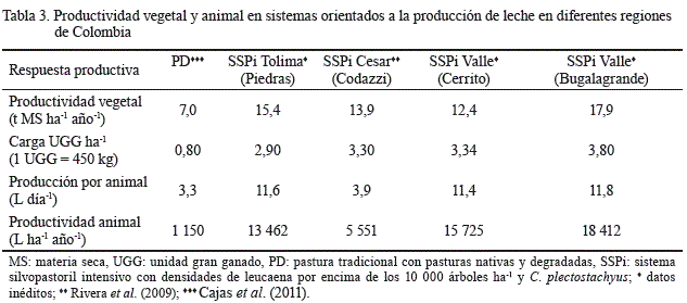 En cuanto a la producción de leche, en la región del Caribe seco colombiano Rivera et al. (2015b) reportaron 5 551 L ha-1 año-1 en un SSPi con L. leucocephala (10 000 arbustos ha-1), C. plectostachyus y M. maximus; y 1 150 L ha-1 año-1 en un sistema convencional de pastoreo sin árboles. Asimismo, en el SSPi el contenido de proteína, grasa y sólidos totales en la leche fue significativamente superior (p < 0,05). Las producciones de sólidos totales, grasa y proteína por animal día-1 fueron de 0,59 vs. 0,51; 0,22 vs. 0,17 y 0,15 vs. 0,13 kg para el SSPi y la PD, respectivamente. Por otra parte, Paciullo et al. (2014) informaron que en Brasil la asociación de leucaena con pasturas de Urochloa decumbens (Stapf) R. D. Webster (= Brachiaria decumbens Stapf.) permite incrementar la producción de leche de 9,5 a 10,4 litros vaca día-1 (p < 0,05).