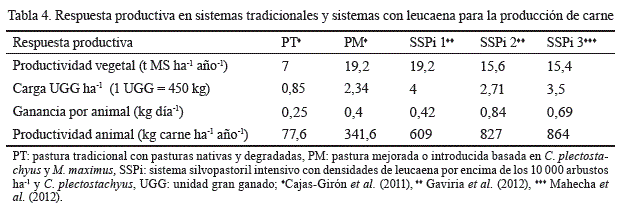 En relación con la productividad cárnica, al analizar en Colombia dos SSPi con leucaena, Gaviria et al. (2012) observaron que las ganancias individuales de peso resultaron mayores en un 45 y 70 %, respecto a las de PM y PD. Además, la productividad por hectárea fue muy superior en los SSPi, gracias a la mayor carga animal (2,34 vs. 4 UGG) y ganancia de peso animal (830 kg ha-1 año-1); mientras que en el país el promedio de producción en sistemas de carne está cercano a los 120 kg ha-1 año-1.