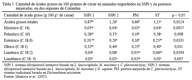 Finalmente, en relación con la calidad de la carne, Montoya et al. (2015) encontraron que animales provenientes de sistemas con leucaena produjeron carne de mayor terneza, mejor pH y color, así como también alcanzaron mayores pesos al beneficio, peso en canal caliente y porcentaje de rendimiento, que los animales de sistemas tradicionales de pastoreo. También se observó que la dieta del SSPi puede mejorar el perfil de ácidos grasos, al incrementar el porcentaje de ácidos grasos insaturados, lo cual genera la posibilidad de entrar a mercados especiales con mayor valor comercial. En la tabla 5 se presentan algunos resultados obtenidos por los autores anteriormente citados en cuanto a la cantidad de ácidos grasos en 100 g de carne.