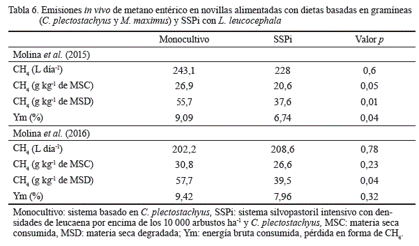 En lo referente a las emisiones entéricas de CH4, Molina et al. (2016) informaron que con dietas basadas en C. plectostachyus e inclusión de aproximadamente 25 % de L. leucocephala, ofrecidas a novillas, estas emisiones pueden disminuir en 15 % por kilogramo de materia seca consumida (MSC), ya que disminuyeron de 43,6 a 37,7 L de CH4 kg-1 de MSC (tabla 6). Además, hubo menor pérdida de energía por producción de CH4 en las dietas con L. leucocephala. Molina et al. (2015) hallaron resultados similares al evaluar las emisiones entéricas de metano en respuesta a una inclusión de 24 % de L. leucocephala en dietas basadas en C. plectostachyus y M. maximus.