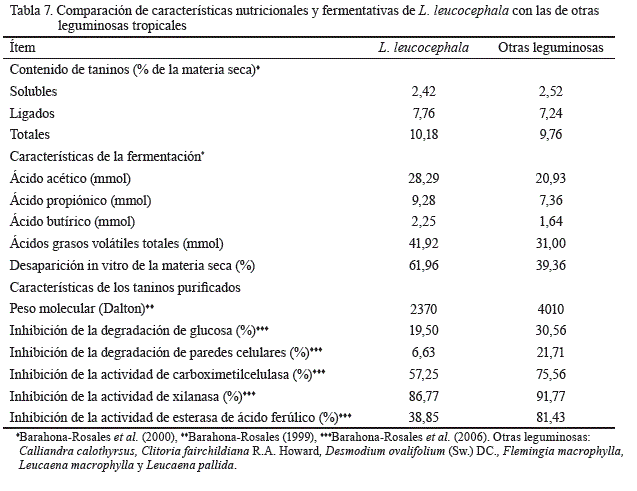 Como se puede observar en la tabla 7, a pesar de contener casi la misma cantidad de taninos ligados, solubles y totales en su forraje que el promedio de las otras leguminosas, el forraje de L. leucocephala fue 1,57 veces más degradable y tuvo mayor acumulación de ácidos grasos volátiles (p < 0,05) cuando fue fermentado en experimentos de producción de gas (Barahona-Rosales et al., 2000). Al evaluar la capacidad de taninos purificados de las mismas leguminosas, con el fin de inhibir la degradabilidad in vitro de varios sustratos o la actividad de varias enzimas hidrolíticas producidas por el hongo anaeróbico Neocallimastix hurleyensis Vavra & Joyon ex I.B.Heath, en la mayoría de las ocasiones se observaron las menores reducciones en estos parámetros en presencia de taninos de L. leucocephala (Barahona-Rosales et al., 2006).