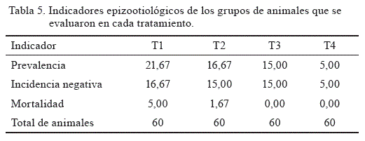 T3 y T4 presentaron los menores porcentajes de prevalencia, con T4 como el más representativo; además, permitieron alcanzar una tasa de recuperación del 100 % de la masa afectada, con cero porcentaje de mortalidad. En los grupos de T1 y T2 se evidenció un deterioro de estos indicadores (tabla 5).