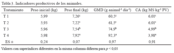 Al finalizar el periodo evaluativo los tratamientos T1 y T2 no mostraron diferencias significativas entre ellos en cuanto a los indicadores productivos (tabla 3), lo que indica que la dosis de 40 mL de IHplus® animal-1 día-1 no tuvo incidencia en el comportamiento productivo de los animales, posiblemente por efecto de la baja concentración de microorganismos y por la velocidad de tránsito de la digesta que, a edades tempranas, es muy rápida y no favorece las condiciones para la colonización de estos en el sistema digestivo (Palomo, 2015).