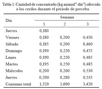 Para cada tratamiento se dispuso de doce corrales con 10 precebas cada uno, para un total de 480 animales. La alimentación con concentrado se efectuó en comederos lineales, tres veces al día, en porciones equitativas (tabla 1), según los procedimientos establecidos para precebas porcinas en la resolución 12/2010 del GRUPOR (Grupo de Producción Porcina, 2013).