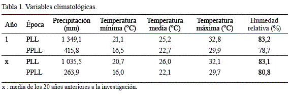 En la tabla 1 se muestran las variables climatológicas durante el periodo experimental. El volumen de las precipitaciones en ambas épocas fue superior a la media de los 20 años anteriores al período de investigación.