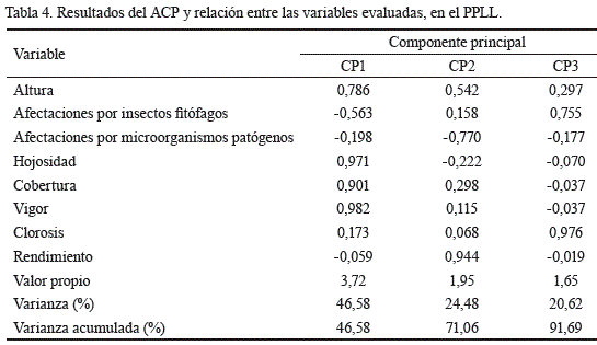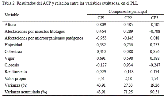 En la tabla 2 se muestran los resultados del ACP durante el período lluvioso (PLL). Se formaron tres componentes en las que se detectó una varianza acumulada de 90,51 %. Las variables que mejor explicaron la varianza en la primera componente (43,91 %) fueron la altura, el rendimiento, el vigor y las afectaciones por microorganismos patógenos (en sentido inverso). La segunda componente extrajo un 27,33 % de la varianza total y estuvo explicada principalmente por la hojosidad y la clorosis; mientras que la tercera componente extrajo el 19,26 % de la varianza, explicada por la cobertura y las afectaciones de insectos fitófagos (en sentido negativo).