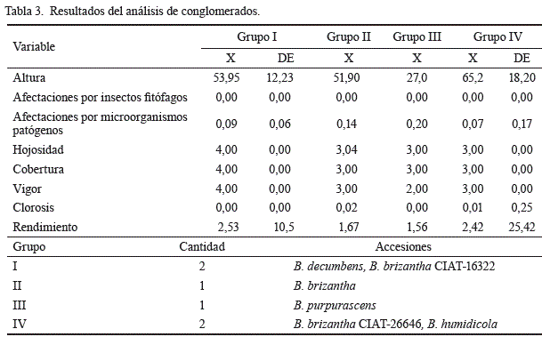 Así, con el fin de identificar las accesiones de mejor comportamiento, se realizó un análisis de conglomerados sobre la base de los resultados del ACP durante esta etapa, el cual permitió la formación de tres grupos (tabla 5).