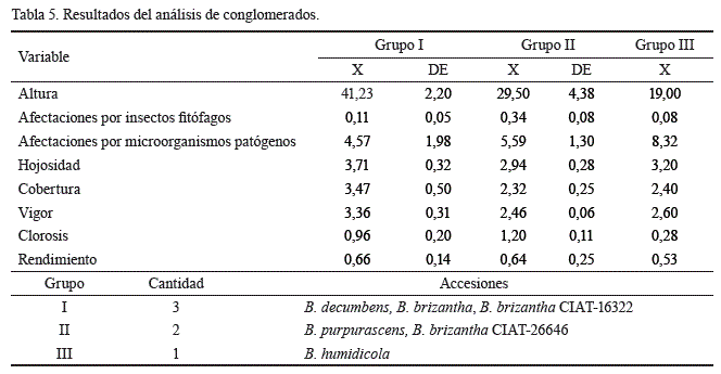 Las accesiones pertenecientes al grupo I (B. decumbens y B. brizantha CIAT-16322) se caracterizaron por ser plantas más hojosas, y de mayor cobertura, vigor y rendimiento; además, mostraron poca afectación por microorganismos patógenos, al igual que las de los restantes grupos, y por el valor obtenido ese grado de afectación no influyó en el comportamiento general de las accesiones. De ellas, B. brizantha CIAT-16322 se ha destacado por sus buenos resultados en zonas con predominio de suelos ácidos de baja fertilidad (Canchila et al., 2008).