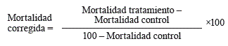 A partir de las 12 h de la infestación, y después cada 24 h hasta la inexistencia de insectos vivos, con vista a conocer el tiempo en que el polvo de mármol blanco causaba el efecto letal a los insectos, se contabilizaron los muertos. Para el cálculo de la mortalidad corregida se utilizó la fórmula de Abbott (1925).