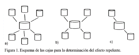 Los tratamientos con el polvo inerte y el testigo se distribuyeron en cajas simétricamente opuestas. En el recipiente central se liberaron 60 adultos sin sexar y, después de transcurridas 24 horas, se contabilizó el número de insectos en cada recipiente. Se hicieron seis réplicas, con 10 insectos en cada caso, y se cambió el número de cajas plásticas periféricas para crear diferentes condiciones que permitieran comprobar de manera acertada la migración (alejamiento) o la atracción de los insectos ante la presencia del polvo de mármol blanco (figs. 1b y 1c).