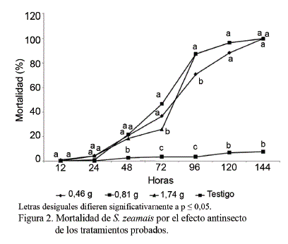 En la prueba del efecto antinsecto del polvo de mármol blanco, las tres dosis mezcladas con los granos de maíz durante su almacenamiento causaron a las 96 h (4 días) un porcentaje de mortalidad de S. zeamais que osciló entre 70,83 y 87,50 %, el cual difirió significativamente del testigo, pues fue inferior al 5 % (fig. 2).