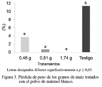 Análisis estadístico. Los datos porcentuales obtenidos tanto del cálculo de la mortalidad corregida por el efecto antinsecto del polvo de mármol blanco, como del de la pérdida de peso de los granos con el uso de este polvo para su protección, se transformaron mediante arcsen (Ѵx/100); y a ambos grupos de valores numéricos se les realizó análisis de varianza con el paquete estadístico Statgraphics versión 5.0 para Windows®, con la diferencia de que la comparación de las medias en los primeros fue a través de la prueba de Tukey HSD, y en el caso de los segundos con la prueba de Duncan.