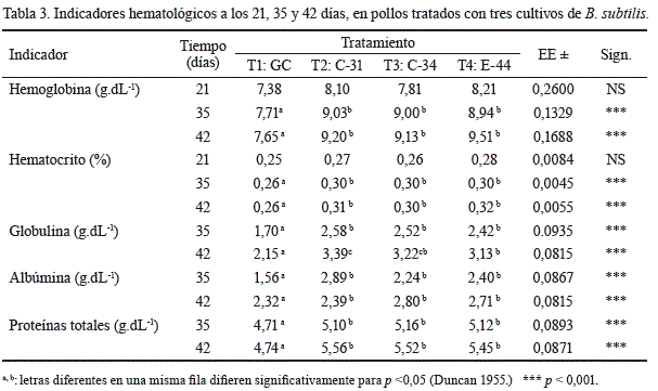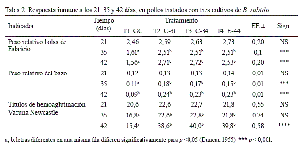 En la tabla 2 se presenta el comportamiento de la respuesta inmune, medida a través de los indicadores inmunológicos a los 21, 35 y 42 días, en pollos tratados con tres cultivos de B. subtilis.