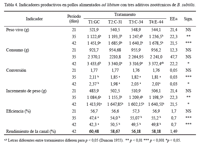 En la tabla 4 se presenta el comportamiento de los indicadores productivos. Se observó una respuesta en las aves a partir de los 35 y 42 días, con excepción de la canal que solo se evaluó a los 42 días, sin diferencias entre los grupos tratados.