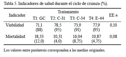 Los resultados de la mortalidad y la viabilidad durante el ciclo de crianza de los pollos se muestran en la tabla 5; no se encontraron diferencias entre los tratamientos.