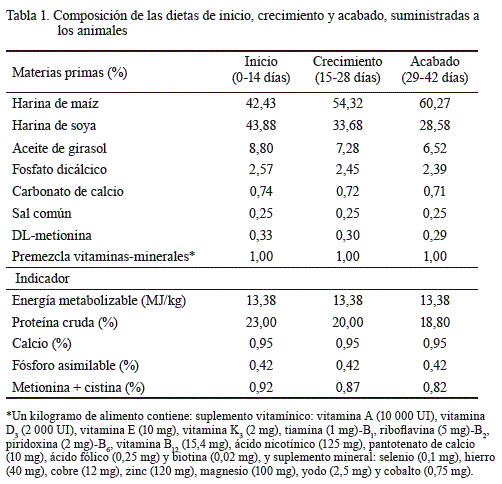 Se suministró alimento y agua ad libitum. La dieta varió en su composición para las etapas de inicio, crecimiento y acabado, según NRC (1994), como se muestra en la tabla 1.