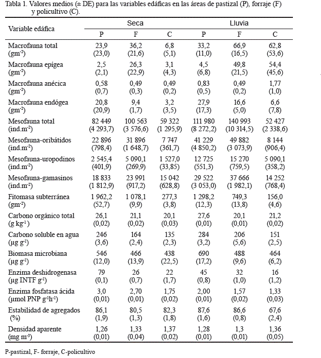 Variables biológicas, físicas y químicas. La mayoría de las variables edáficas estudiadas (10) mostraron valores superiores en las áreas de pastizal y forraje, tanto en los períodos de seca como de lluvia (tabla 1). La macrofauna total y la endógea siguieron este patrón, aunque la total no lo mantuvo en la temporada de mayores precipitaciones, pues sus valores más altos se manifestaron en el forraje y en el policultivo y no en el pastizal. La macrofauna endógea estuvo representada por las lombrices de tierra, que presentaron comúnmente una biomasa alta en los ecosistemas de pastizales, lo que coincide con lo hallado por Lavelle (1997), Bartz et al. (2013) y Chávez-Suárez et al. (2016). Dentro de la macrofauna, los organismos epígeos y anécicos se favorecieron con el manejo del forraje y del policultivo, sobre todo durante la lluvia. Ambos grupos funcionales tienen principalmente función detritívora y, por tanto, pudieron estar beneficiados por la entrada y calidad de la hojarasca de leucaena y de los diferentes cultivos en estos sistemas (Cabrera-Dávila et al., 2007).