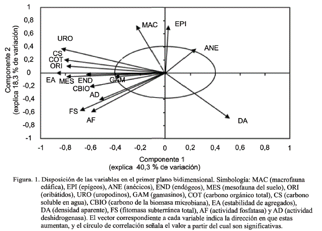 Análisis integrado de las variables. El análisis de componentes principales de las variables biológicas, físicas y químicas permitió conocer las correlaciones que se establecieron entre estas y su contribución, según el impacto producido por la conversión del área de pastizal a forraje y policultivo y la estacionalidad. En general todas las variables, excepto los gamasinos de la mesofauna (GAM), desempeñaron un papel significativo (p < 0,05) en el estudio, de acuerdo al círculo de correlación interno propuesto por Fariñas (1996), que en el primer plano bidimensional explicaron entre las dos primeras componentes más del 55 % de la variación total de los datos (fig. 1).