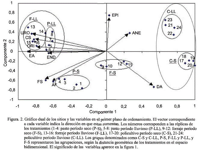 Se observó un manojo de vectores que estuvieron correlacionados entre sí y negativamente con el eje 1, representados por las variables: MAC, EPI, END, MES, ORI y URO, COT, CS, CBIO EA, FS, AF y AD. A este grupo de vectores se opusieron las variables DA y ANE, que estuvieron correlacionadas positivamente con el primer eje; mientras que MAC y EPI estuvieron correlacionadas positivamente con el eje 2. El comportamiento de las dos últimas variables fue independiente del de las variables URO, CS, COT, ORI, EA, MES y END (fig. 1).