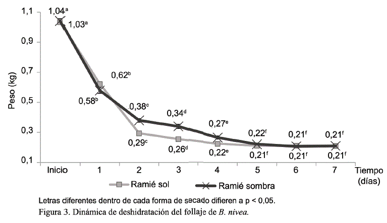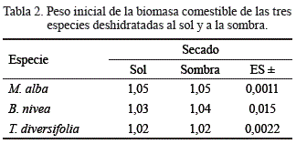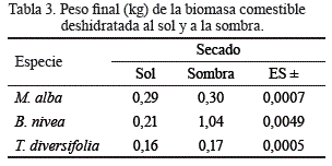 El peso final de los follajes expuestos al proceso de deshidratación al sol y a la sombra se muestra en la tabla 3. En ninguna de las tres especies se encontraron diferencias significativas en el peso seco final del follaje entre las dos formas de deshidratación.