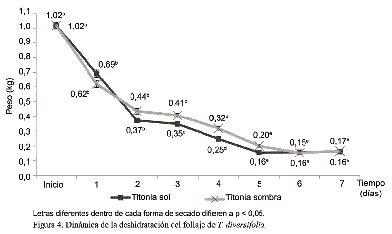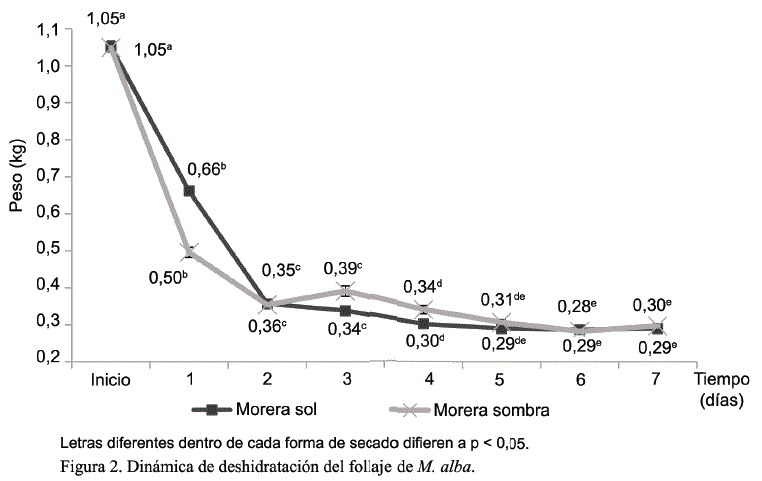 La estructura de la nave donde se deshidrató el follaje a la sombra permitió el paso del aire, lo que contribuyó a la pérdida de agua y benefició el proceso de secado; ello coincide con lo señalado por Pineda-Castro et al. (2009), quienes informaron que, de las variables del clima, la temperatura y la velocidad del aire fueron las que mayor influencia manifestaron en la deshidratación del forraje de morera.
