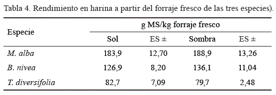 Se cuantificó el rendimiento en harina, obtenido a partir del follaje verde (tabla 4). El forraje de morera produjo 1,4 veces más harina por kilogramo de materia verde que el ramié, y 2,3 veces más que la titonia. Estas diferencias en producción entre las tres especies fueron informadas por López et al. (2012).