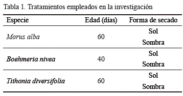 En este sentido, la morera (Morus alba), el ramié (Boehmeria nivea (L.) Gaud.) y la titonia (Tithonia diversifolia) son plantas con una alta producción de biomasa comestible y de elevado valor nutricional. Por esas características, sus excedentes pueden ser conservados en forma de harina y han sido incluidas como plantas proteicas en dietas de diferentes especies de animales (Ruíz et al., 2014). En Cuba se ha estudiado la cinética de deshidratación durante el secado al sol, pero existe poca información de la cinética de deshidratación a la sombra, que permita al follaje alcanzar en poco tiempo de exposición un elevado contenido de materia seca. Es por ello que el objetivo de esta investigación fue estudiar la influencia de la forma de secado (al sol o a la sombra) del follaje de M. alba, B. nivea y T. diversifolia, sobre la dinámica de deshidratación y la calidad de la harina.