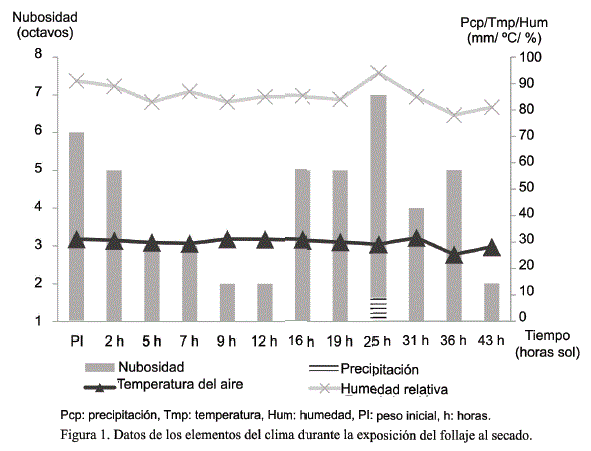 Condiciones climáticas en la etapa experimental. Los elementos del clima durante el período experimental fueron suministrados por la Estación Meteorológica de la EEPF Indio Hatuey, ubicada a menos de 200 m de distancia del área experimental. En la figura 1 se muestra el resumen de los datos climáticos registrados por la Estación durante los días en que se deshidrataron los follajes y a la hora del pesaje (fig. 1).