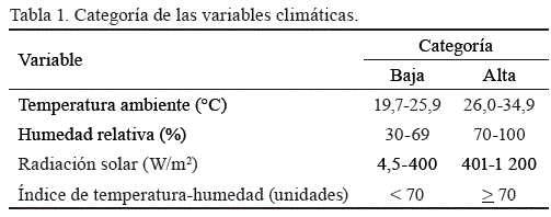 En cuanto al efecto de algunas variables climáticas sobre las actividades realizadas por las borregas durante el experimento, se establecieron categorías o niveles (bajos y altos) para cada uno de los factores climáticos (tabla 1), que permiten estudiar las interacciones de manera más precisa.