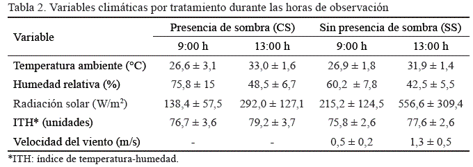 Los valores promedio para las variables climáticas, durante las horas de medición de las actividades efectuadas por las borregas, se presentan en la tabla 2. Los valores de TA y HR fueron similares a los obtenidos por López et al. (2015), y son considerados normales en la zona de estudio; además, los ITH promedio para SS y CS (72,9 ± 5 y 73,7 ± 5,4, respectivamente) fueron similares a los reportados por Saravia (2009) y se consideran como de alerta por estrés, ya que superan el umbral de 72 unidades de ITH.
